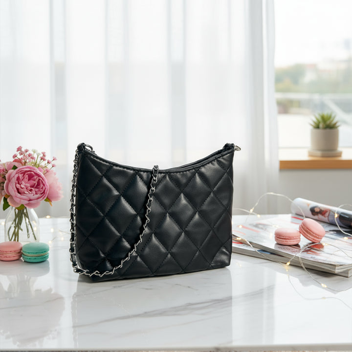 Rhombus Pattern Chain Shoulder Crossbody Bag (Black)